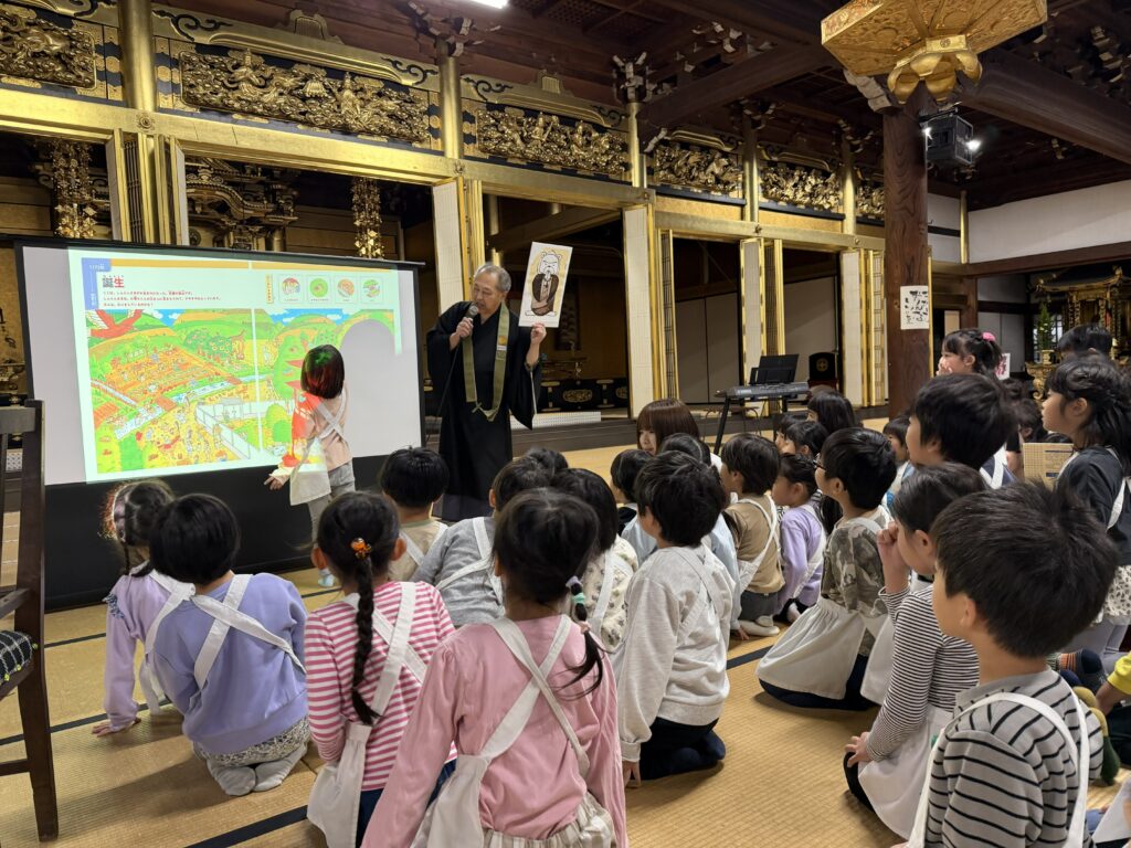 さらに、大きな絵図の中から、色々な場面を説明いただき、幼い親鸞さまやお母さん、キャラクターなどを楽しくさがしました。
