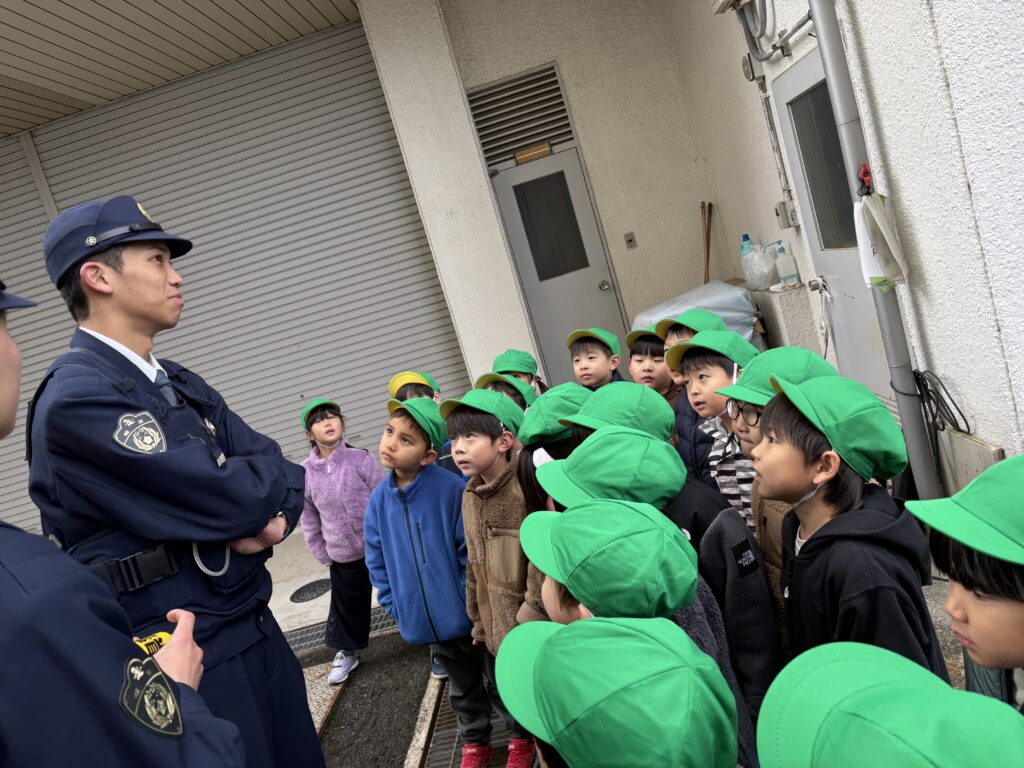 毎月の誕生会の将来の夢として、いつも「警察官になりたいです。」、「パトカーの運転手になりたい。」と、人気の警察官さんです。やっぱり世の中の安全を守る警察官さんは、とってもかっこよくて、憧れをより強くもちました。